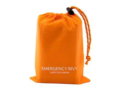Nödsovsäckarna levereras i 2-pack i en tydlig orange förvaringspåse med texten ”Emergency Bivy” tryckt på påsen.
